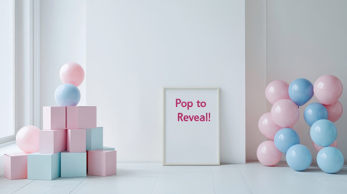 Minimalistic setup with a white wall, a « Pop to Reveal! » sign, and pink and blue balloon boxes stacked in a pyramid shape.