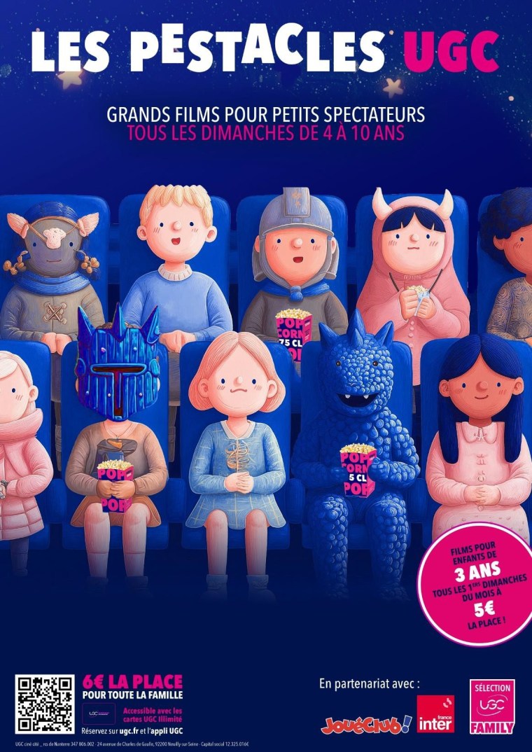 Les Petits Pestacles UGC dès 3 ans Depuis la quatrième saison, UGC propose également les « Petits Pestacles UGC », destinés aux enfants dès 3 ans. Chaque premier dimanche du mois, une projection spéciale permet aux tout-petits de découvrir le cinéma dans un cadre adapté et convivial. Le tarif unique de 5 € rend cette expérience accessible aux familles, favorisant ainsi la transmission de la culture cinématographique dès le plus jeune âge.