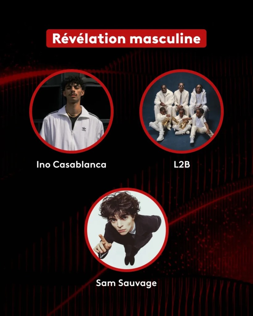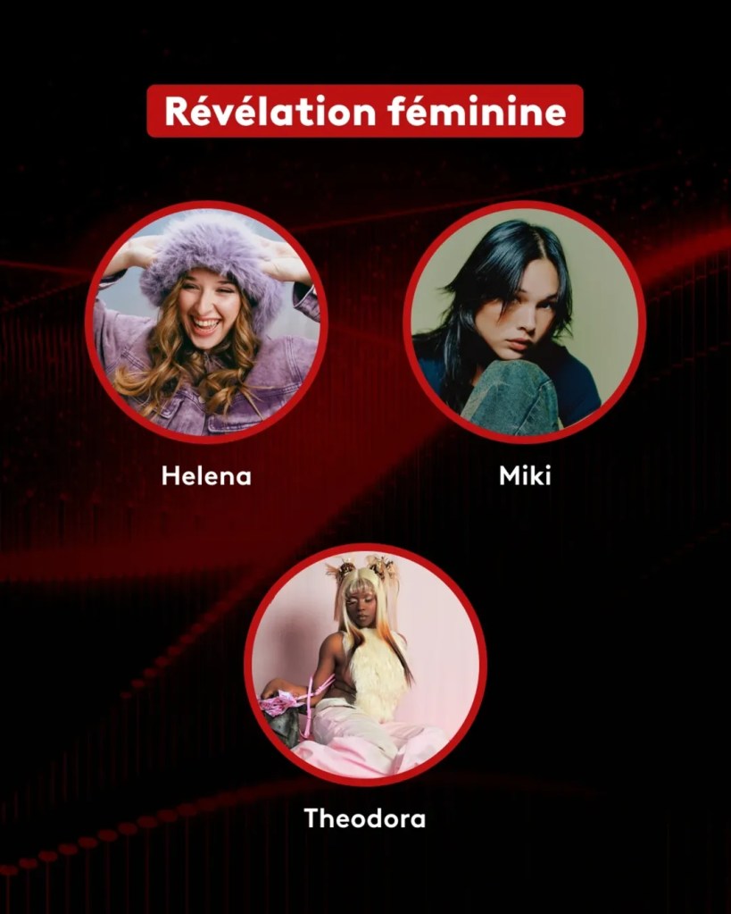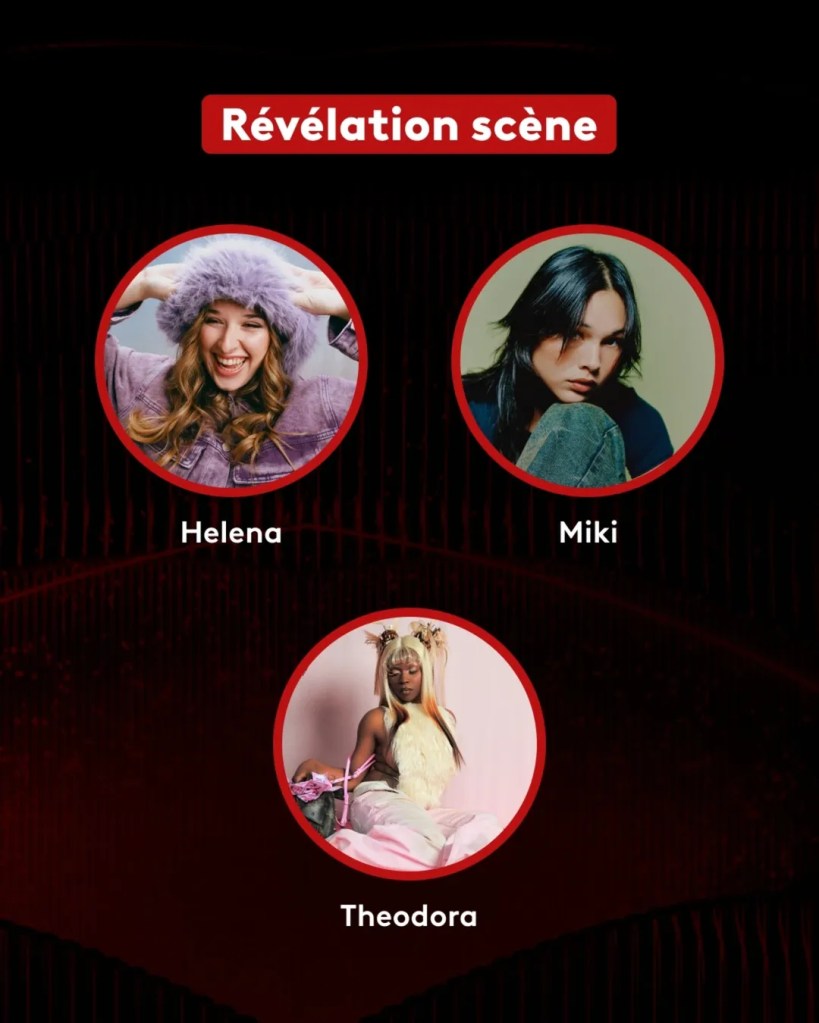 Les catégories révélation féminine, masculine et scène mettent en lumière des artistes en pleine ascension. Ino Casablanca, L2B et Sam Sauvage se distinguent chez les révélations masculines, tandis que Héléna, Miki et Theodora se retrouvent dans plusieurs catégories, confirmant leur statut de figures montantes incontournables. Ces nominations traduisent une attention particulière portée aux artistes capables de fédérer un public sur scène autant que sur les plateformes numériques.