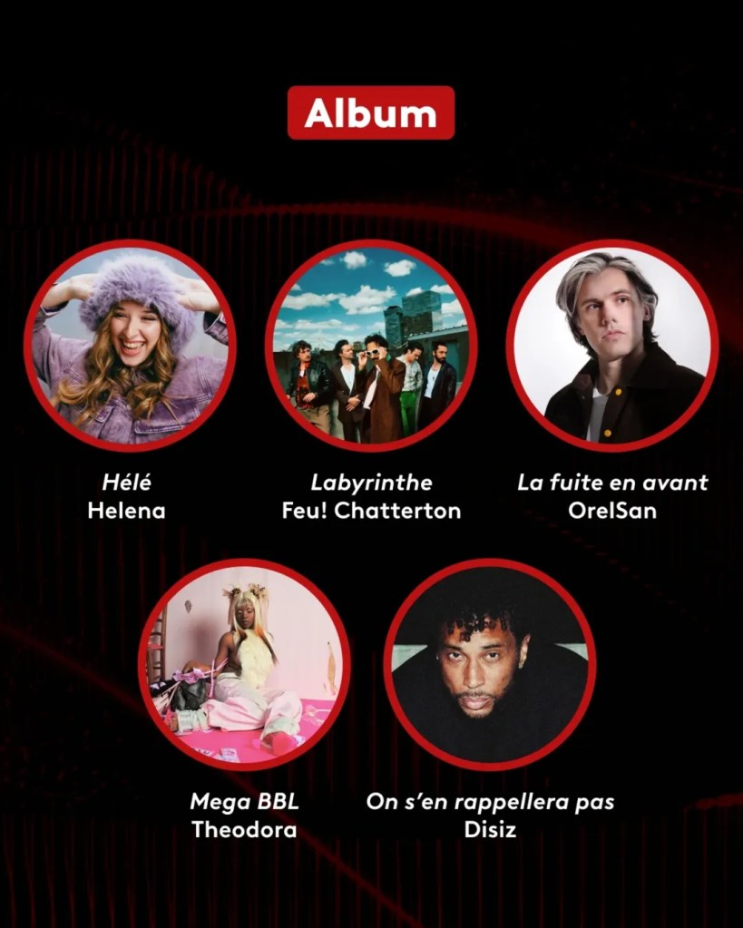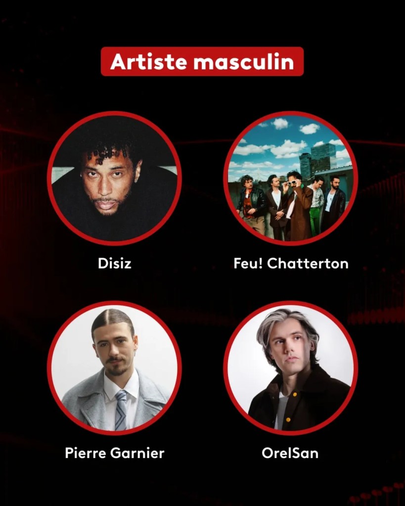 Côté masculin, la compétition oppose des artistes confirmés aux univers bien identifiés. Disiz, Feu! Chatterton, Pierre Garnier et Orelsan se disputent le titre d’artiste masculin de l’année. Cette sélection reflète un équilibre entre écritures introspectives, pop alternative et rap grand public, témoignant de la pluralité des esthétiques qui coexistent aujourd’hui sur la scène française.